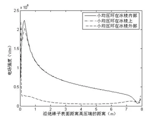 对各种型号均压环在覆干冰时的模型进行仿真计算,得出沿距离绝缘子杆中心140mm处表面的电压和电场分布图如图5、图6所示,由图5可以看出复合绝缘子在全部覆干冰时,当小均压环在冰棱外部时,绝缘子的表面电压分布几乎呈线性分布,而小均压环在冰棱内部时,绝缘子的表面电压分布不均匀;由图6可以小均压环在冰棱外部时,绝缘子的电场分布相对比较均匀,而小均压环在冰棱上和内部时绝缘子的表面电场分布则不均匀。