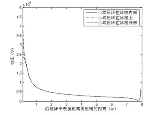对各种型号均压环在覆湿冰时的模型进行仿真计算,得出沿距离绝缘子杆中心140mm处表面的电压和电场分布图如图7、图8所示,可见,当复合绝缘子的冰棱上出现水膜时,无论小均压环位于冰棱的内部还是外部,表面电压和电场分布都不均匀。此时,需要采取其他的均压措施。